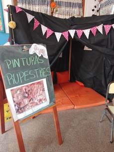 En una segunda clase, la docente dispuso algunos libros y tablets a través de los cuales propuso a los niños investigar cómo se vestían y cómo eran las viviendas de los nativos de América. Luego les brindó materiales –rollos de papel y cartulina – para crear un muñeco de un nativo. A continuación, se visualizó un video sobre arte rupestre (CNTV Infantil, 2016) y se les solicitó a los niños que realizaran pinturas sobre papel madera. Durante estas jornadas se encontraba en la sala una casa realizada con tela, imitando una vivienda indígena, sobre la cual se presentaron diversas imágenes de pinturas rupestres, incorporando luego las producciones de los estudiantes (Figura 3). Al finalizar el proyecto, esta se convirtió en una parada del Museo Histórico creado en la Sala junto con las otras efemérides.