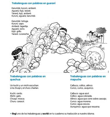 En el Nivel Primario de la institución observada, las docentes de manera conjunta planificaron actividades diferenciadas para cada ciclo, mientras que 2do grado tuvo a su cargo la realización del acto. En este curso, la temática se comenzó a trabajar la semana previa al 12 de octubre en el marco de una secuencia didáctica breve. La misma incluyó la indagación de los conocimientos previos de los estudiantes sobre la idea de diversidad cultural, la observación de imágenes sobre la actualidad de pueblos originarios, y el trabajo con lenguas indígenas, a través de trabalenguas y frases (Figura 5). Paralelamente en horas de música ensayaron la canción “Todos somos pueblo” de Soledad Pastorutti buscando además de aprender la letra, reflexionar sobre algunas frases en lenguas originarias, su significado y valor. Por último, completaron con la ficha de efemérides del libro “Misterio de Tiberio 2” (Figura 6). En este recurso puede observarse que se refiere al 12 de octubre como la fecha en que “celebramos el encuentro entre diferentes culturas” (Edelvives, 2016).