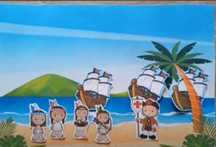En la Sala de 4, la docente narró a los niños –que dejaron sus bancos y mesitas para sentarse en almohadones- la historia de Colón apoyada por una cinta fotográfica. Al finalizar el relato la docente les preguntó “¿está bien lo que hizo Colón al querer cambiar las creencias que tenían otras personas?” y los invitó a realizar un dibujo sobre lo que entendieron.