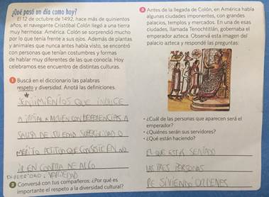 En este marco, y en relación al reconocimiento identitario que se observa en el abordaje del 12 de octubre, este oscila entre caracterizar a los pueblos indígenas como otros que viven en el presente, a los que hay que respetar o como aquellos que nos legaron algunas pautas culturales. Así lo ilustra un fragmento del texto leído en 5to grado: “La cultura de nuestro país se formó a partir de algunas costumbres heredadas de los pueblos originarios americanos y las personas que llegaron a nuestro país provenientes de muchas partes del mundo”. Podría interpretarse como una revalorización de la “cultura” de los pueblos, pero escindida de los sujetos que no se presentan como actores sociales con sus propias complejidades, intencionalidades y dilemas.