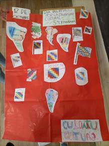 En 5to grado, luego del acto, la docente explicó de manera oral y escribió en el pizarrón algunas consignas que hacían referencia a: “¿quién descubrió América y que pasó con los pueblos originarios después de la llegada los españoles? ¿Por qué se llamaba a este día “Día de la Raza?, ¿por qué se lo cambió por el Día del Respeto a la Diversidad Cultural Americana?”. A continuación, repartió fotocopias de dos carillas, y los estudiantes reunidos en grupos se dispusieron a responderlas. Al finalizar, la docente les propuso armar una nube de palabras en un afiche representando todo lo que significa ese día. Las producciones de los estudiantes consistieron en banderas de Whipala, mapas de América y un árbol, y la elección de palabras como: diversidad, cultura, respeto, derechos, ley, aceptarnos (Figura 7).