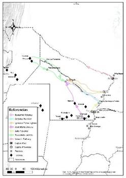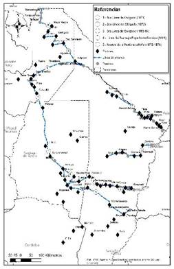 [5] En este trabajo comprenderemos al Gran Chaco como la región construida estatalmente como tal, es decir, el espacio que hoy comprenden el este de Salta y Santiago del Estero -limitado por el río Salado-, el norte de Santa Fe -desde 1870 a 1872 limitado por Fuerte Belgrano a 100 km de la capital santafecina, y desde 1872 a 1884 por el arroyo del Rey en la actual ciudad de Reconquista-, la totalidad de las provincias del Chaco y Formosa, y entre 1870 y 1878 el sudoeste de Paraguay (Figura 1).