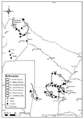 A pesar de cumplir funciones análogas, muchas veces en coordinación, las fuerzas implicadas en lo que se llamó la conquista del Chaco fueron diferentes y sus papeles en este proceso también. Entre 1870 y 1899 fue el Ejército de Línea[8] el que desempeñó el doble papel guerrero-securitario, mientras que otras experiencias militares, como las Guardias Nacionales,[9] hacían el relevo de policía en lugares como Villa Occidental (primera capital del gobierno del Gran Chaco), Resistencia, Formosa o Reconquista, aunque los distintos regimientos que pasaron por la región cumplían la función de seguridad, sobre todo en sus asentamientos de paz en los fortines. Entre 1870 y 1884 se pueden marcar dos polos de acción militar: las comandancias de las fronteras Norte de Santa Fe (o Norte) al mando del coronel Manuel Obligado con su asentamiento, desde 1872, en Reconquista cerca de la ex misión jesuítica de San Jerónimo del Rey, y la comandancia de Salta en Dragones asentada cerca de Colonia Rivadavia.[10] Las estrategias guerreras desempeñadas por el Ejército de Línea se basaban en el adelantamiento de las líneas de fronteras, el establecimientos y ampliación de los fortines como centros ofensivos-defensivos y las campañas (Cuadro 1, Figuras 2, 3 y 4).