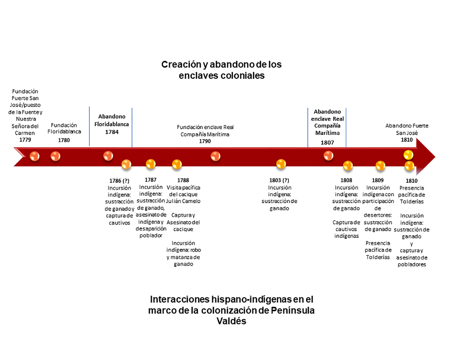 El presente trabajo tiene por objeto abordar el carácter predominantemente conflictivo de las relaciones interétnicas en el contexto de los enclaves coloniales españoles establecidos en Península Valdés (provincia de Chubut, República Argentina): el Fuerte San José y el Puesto de la Fuente (1779-1810). A nivel específico, se busca presentar, describir y examinar a lo largo del tiempo los episodios de tensiones y violencia interétnica en dichos establecimientos. Para ello, nos centraremos en el análisis y la confrontación crítica de la información suministrada por las fuentes primarias a lo largo de los 31 años de ocupación de los asentamientos. La comprensión de la singularidad de las relaciones interculturales en estos escenarios, necesariamente implicó abordarlas desde una perspectiva comparativa en función de su trayectoria histórica y regional más amplia en Patagonia durante el lapso temporal considerado. En consecuencia, fue posible establecer un protagonismo destacado de grupos indígenas procedentes de Patagonia Austral, así como la identificación de múltiples causas en la génesis de los malones que experimentaron estos escenarios. Estos resultados ponen en evidencia la compleja trama de los vínculos interculturales y las relaciones coloniales durante el período colonial tardío en Patagonia.