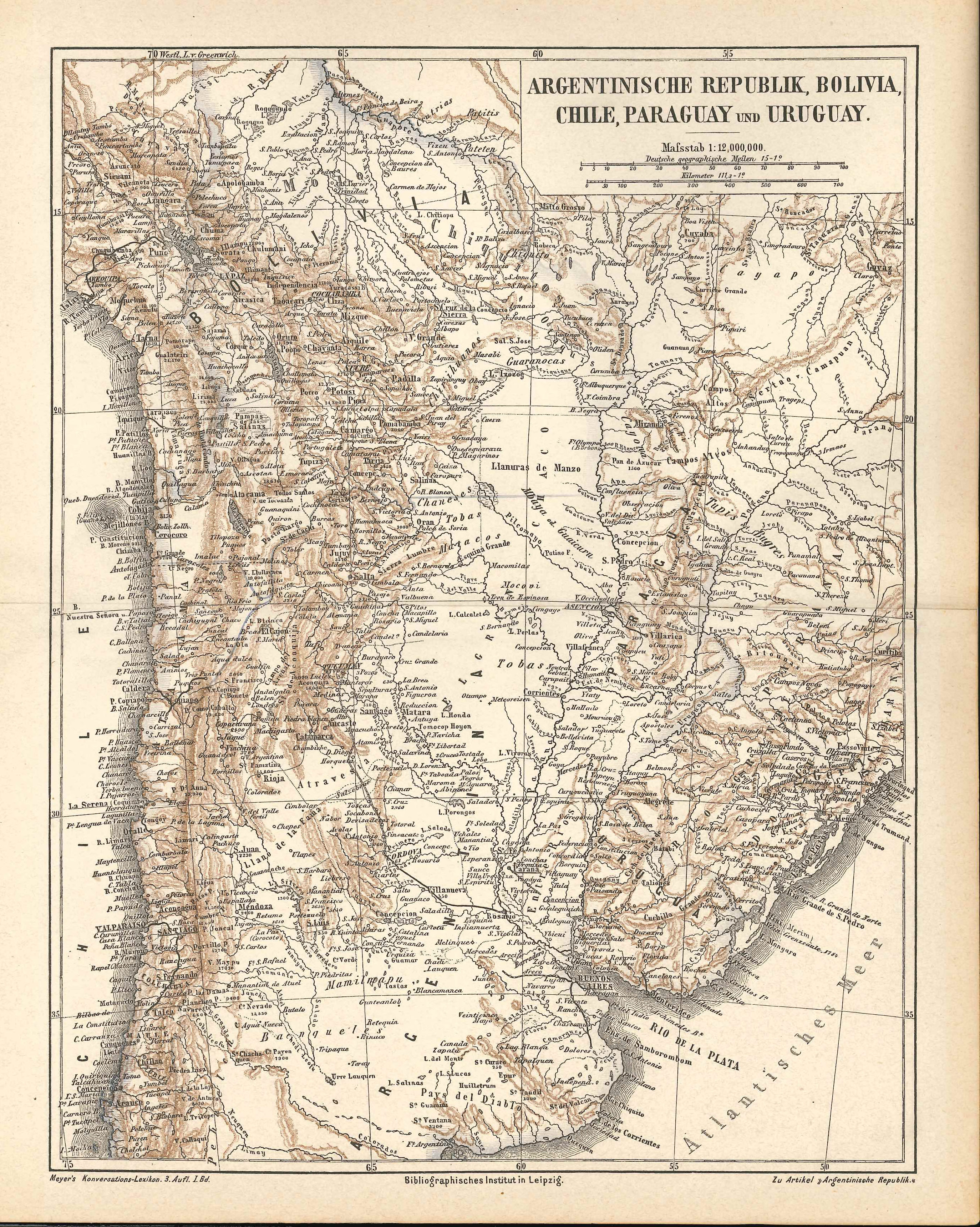 Mapa de Argentina, Bolivia, Chile, Uruguay y Paraguay. Enciclopedia alemana Meyer, tercera edición (Leipzig, 1874).